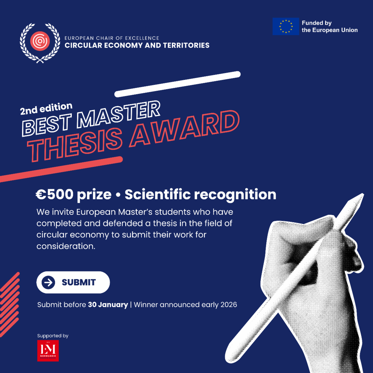The European Chair of Excellence on Circular Economy and Territories (EM Normandie) launches the second edition of its Best Master Thesis Award. This prize recognises outstanding Master’s theses in the Humanities and Social Sciences that contribute to advancing research on the circular economy and its territorial dimensions.