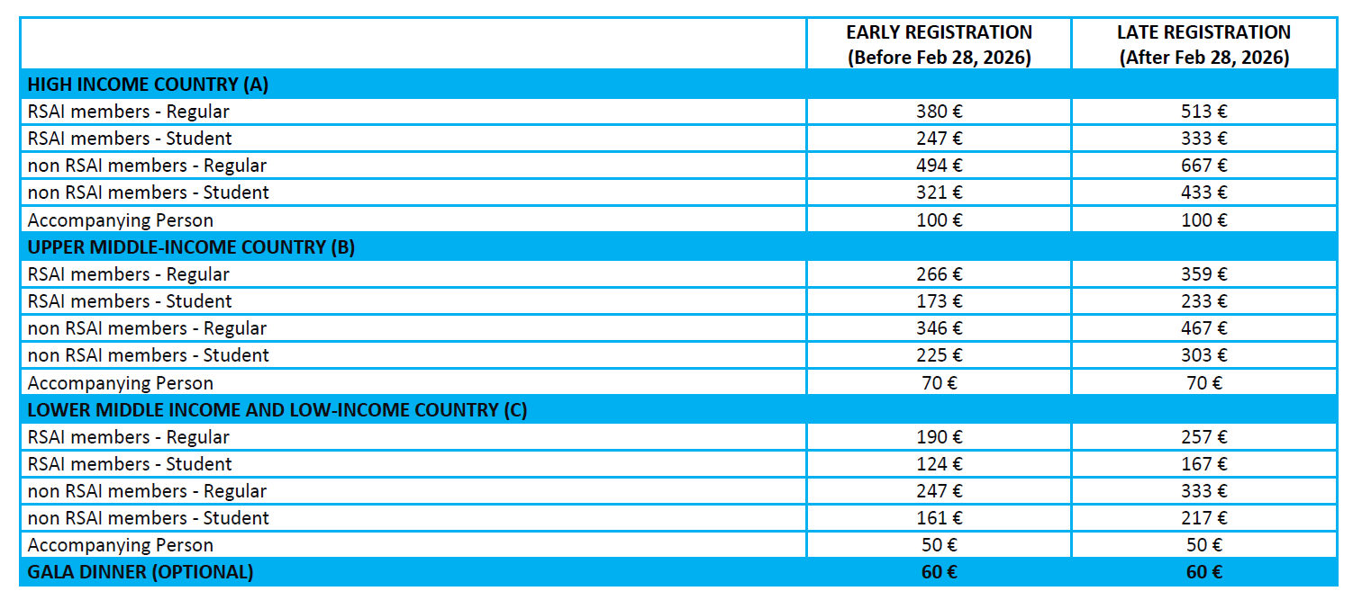 - Student delegate fees are applicable for: postgraduates who have not reached the age of 34 years on December 31, 2026, and candidates to the RSAI Young Researchers Prize (Papers PY type).